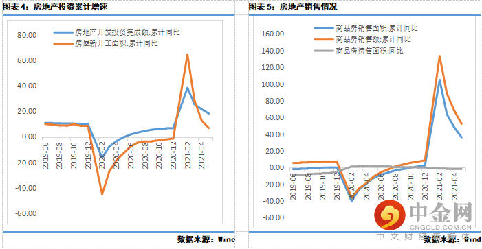 5月份,规模以上工业增加值同比实际增长8.8%,两年平均增长6.6%(较前值回落0.2个百分点);社会消费同比增长12.4%,两年平均增速为4.5%(较前值回升0.2个百分点);1-5月,固定资产投资累计同比增长15.4%,两年平均增长4.2%(较前值回升0.3个百分点),其中,制造业投资同比增长20.4%,两年平均增速由1-4月份下降转为增长0.6%(前值为下降0.4%);房地产开发投资同比增长18.3%,两年平均增长8.6%(较前值回升0.2个百分点);基础设施投资同比增长11.8%,两年平均增长2.6%(较前值回升0.2个百分点)。