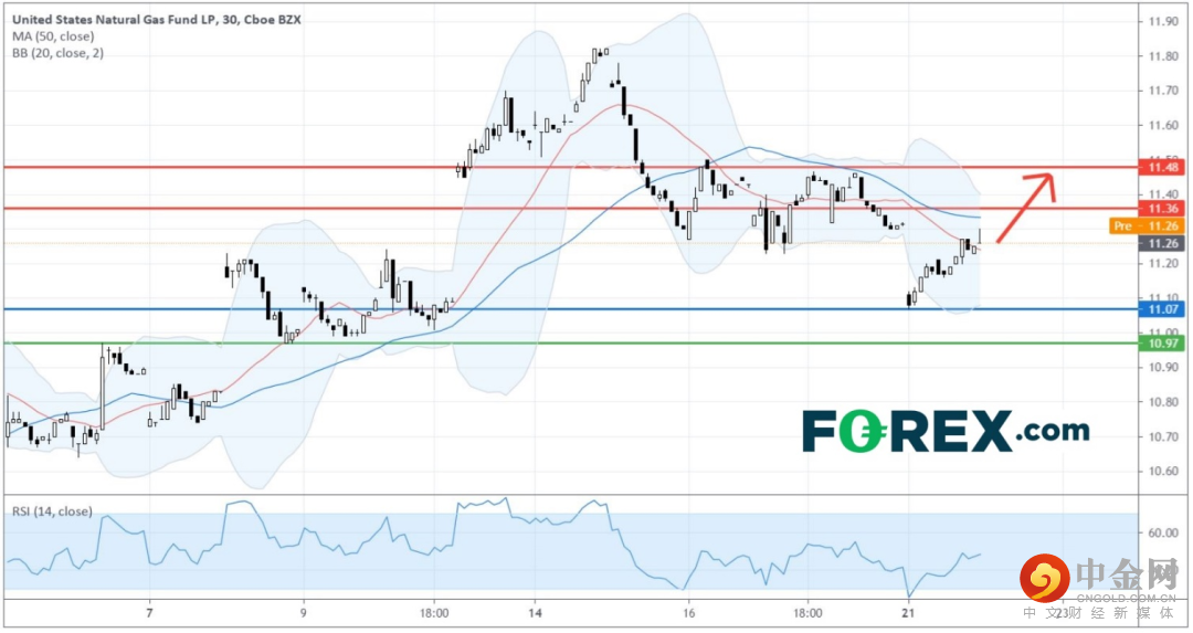 在30分钟图上,美国天然气基金 (U.S. Natural Gas Fund,美国股票编号 : UNG) 昨日裂口低开,但其后续步补回裂口,并收盘在20节均线之上,技术格局趋稳。