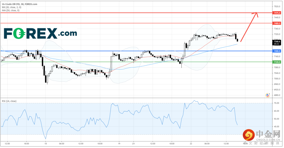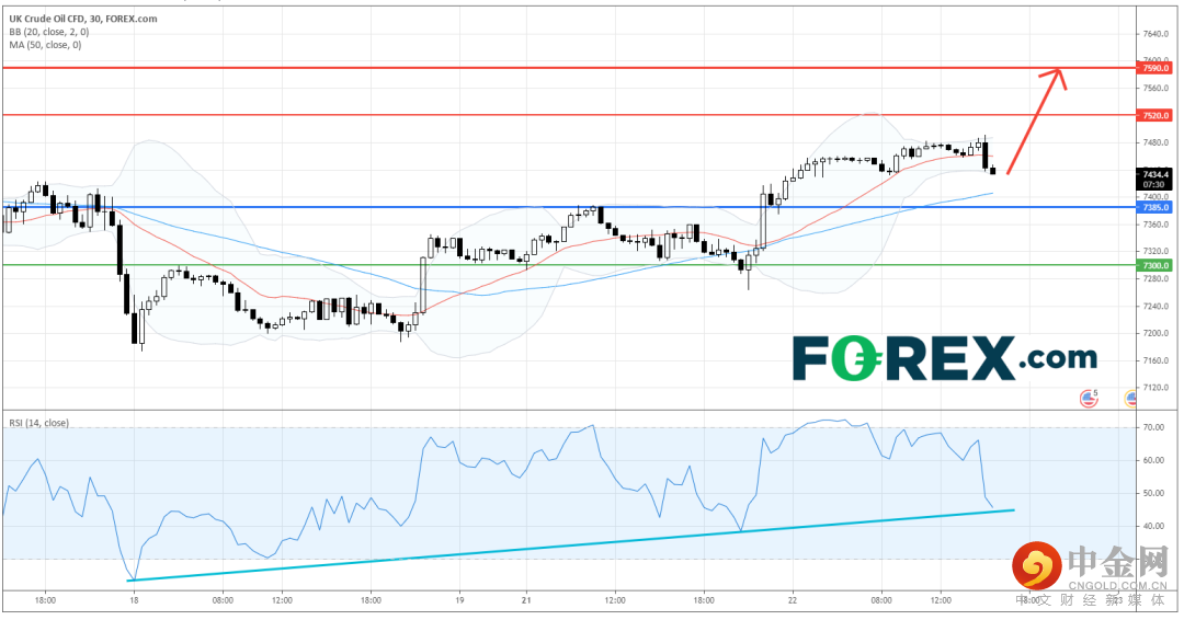 只要英国原油CFD维持在主要支持 (止损) 位7,385点之上操作,料将上升至7,520点和7,590点作目标。