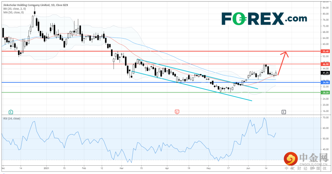 全球领先的光伏产品制造商 晶科能源 (Jinko Solar ,美股预託证劵编号 : JKS) 的预託证劵股价自去年10月高位大幅下跌近70%后展开反弹。根据咨询机构PV InfoLink公布的2020全年组件出货排名统计,晶科能源的组件出货量排名全球第二,紧随第一名的隆基股份 (601012.SH) 之后 。