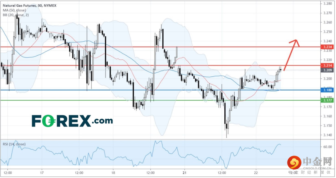 看涨的主要支持 (止损) 位已上调至3.188美元。若天然气期货价格能维持在此水平之上操作,将向上行目标3.214美元和3.234美元进发。