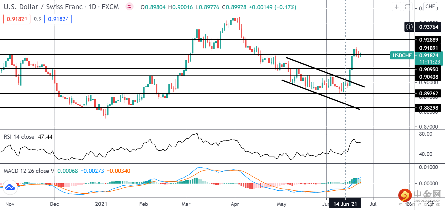 上周的美元兑瑞郎突破交易高于其初始目标 0.9189,但价格现在停滞不前,已回落至该水平以下。如果今天远高于预期,这可能有助于重新点燃交易,在 MACD 和 RSI 的支持下,将价格推高至下一个目标 0.9288。然而,如果今天的数据弱于预期,我们可能会看到接下来进一步回落至 0.9095 的水平。