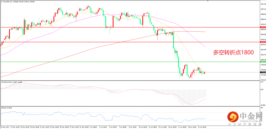 4小时图看,金价长阴下破后,短期跌势有所缓解,但空头趋势依然明显,1800成为短期阻力,MACD绿柱缩短,RSI指标走平,日内震荡下行概率较大。