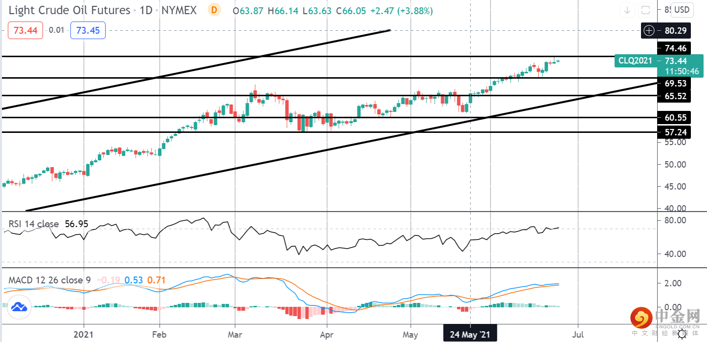 原油价格的上涨使价格上涨以测试 74.46 的阻力位,该阻力位目前继续保持。鉴于长期趋势,在牛市通道内,重点是近期进一步上涨。然而,RSI 和 MACD 的看跌背离表明有修正空间。 69.53 是需要注意的关键下行支撑。