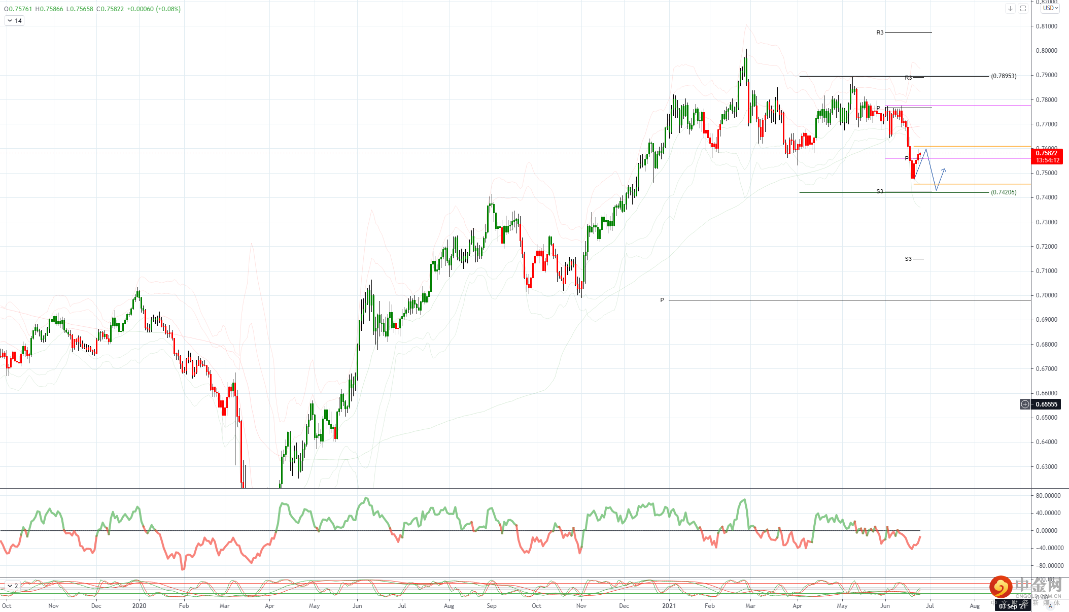澳元/美元走低的理由在上周末似乎很有说服力。在 FOMC 会议和主要美联储成员发表评论后,美联储的预期转为鹰派。美联储的观点与澳大利亚储备银行的鸽派信号形成鲜明对比。自 2020 年第一季度以来,澳元/美元强劲上涨的主要因素之一是铁矿石和铜的大幅上涨。上周两种大宗商品均承压,因市场呼吁它们准备向下修正。澳元/美元多头似乎还没有准备好认输。根据摩根士丹利本周的一份报告,杠杆交易员表示“做多澳元一直是全球复苏的首选方式”。从股市的价格走势来看,美联储对前景的鹰派调整并未减弱对全球经济将继续从大流行中强劲反弹的乐观情绪。澳元/美元已突破 200 日均线 0.7558 以缓解下行压力,但需要突破 0.7891/0.7478 的 38.2 斐波纳契回撤位 0.7635 以确认底部已到位。相反,跌破 0.7475 可能会激励澳元/美元的空头并加速价格下跌。