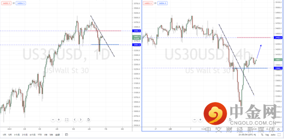道琼斯指数:短期价格继续上行反弹,现阶段趋势也正处于在关键的下降趋势线的压制区域附近。从日内4小时级别,价格在突破下降趋势线后,继续回测水平支撑带33840.3附近起稳。可适当关注价格调整继续上行的多头机会,上方目标位置参考34425.8附近。