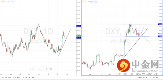 美元指数天图:目前价格继续处于在回测阶段中,下方有上升趋势线的支撑作用,短期水平支撑带91.553附近。虽然整体格局在多头流向,但从日内4小时级别,价格在上方有下降趋势线的压制作用,可适当关注价格在此区间测试后起稳后的多头机会,上方目标位置参考93.051附近。