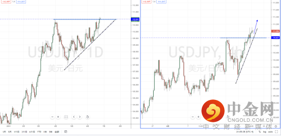美日天图:目前行情虽然上行有突破重要压制区域110.943附近,虽然整体趋势依旧处于在多头趋势中,但短期价格上行力度相对牵强。从日内4小时级别,可适当关注价格回测支撑带110.827附近后再次起稳上行的多头机会,目标位置参考周线前期高点附近。