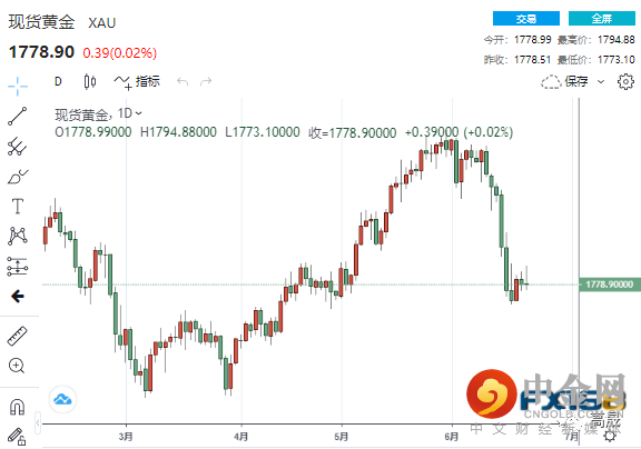 现货黄金收报1778.90美元/盎司,上涨0.39美元或0.02%,美市盘中一度触及1773.10美元/盎司低点,较1794.88美元/盎司高点回落逾21美元,但尾盘自低位有所回升。