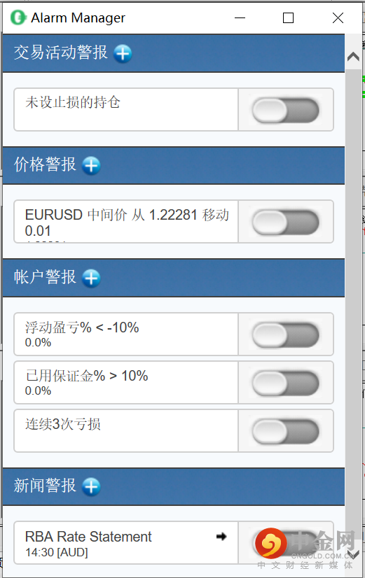 警报管理器本质上是一套组件,可用于创建完全个性化的和自动化的交易伴侣。比如,您可使用警报管理器做以下任何一件事或以下所有事: