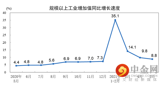 5月份,规模以上工业增加值同比实际增长8.8%(以下增加值增速均为扣除价格因素的实际增长率),比2019年同期增长13.6%,两年平均增长6.6%。从环比看,5月份,规模以上工业增加值比上月增长0.52%。1—5月份,规模以上工业增加值同比增长17.8%,两年平均增长7.0%。