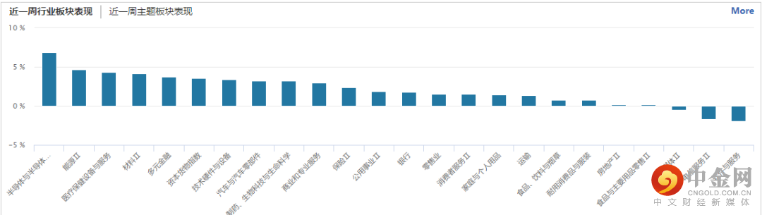 从行业板块表现来看,半导体、能源、医疗保健设备、材料、金融等涨幅居前,软件与服务、电信、媒体、食品、房地产等跌幅居前。