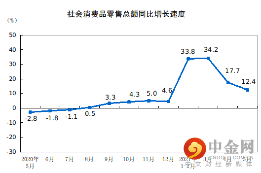 5月份,社会消费品零售总额35945亿元,同比增长12.4%;比2019年5月份增长9.3%,两年平均增速为4.5%。1—5月份,社会消费品零售总额174319亿元,同比增长25.7%,两年平均增速为4.3%。其中,除汽车以外的消费品零售额156304亿元,增长24.4%。