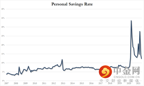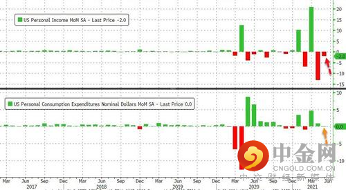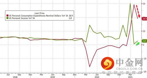 当然,由于低基数效应,美国居民收入同比增长温和加速,而支出增长显著放缓(但数值较高)。