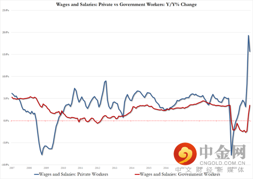 在细分收入方面,政府工资同比增长3.5%,高于4月份的1.3%,而私人工人工资同比增长15.7%,低于4月份创纪录的19.3%。