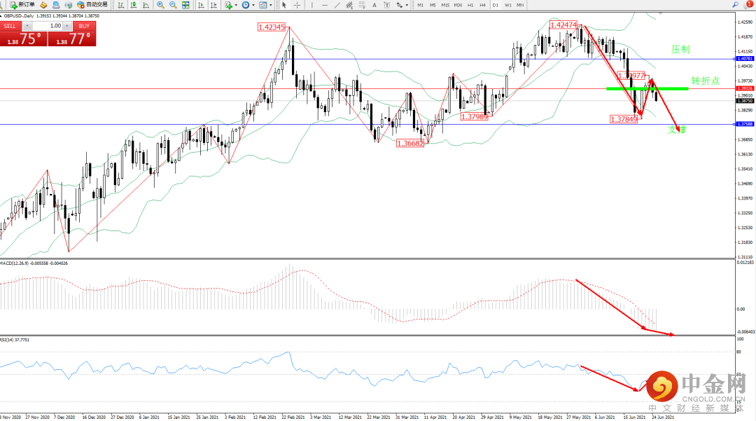 高位空头动力延续布林带指标下轨附近不断下行,低位抵达1.37849位置后短暂反转上移,但下行趋势已然形成,空头动力持续下挫,布林带指标呈收口不断向下移动中,上方压制关注1.40781位置附近,低位支撑关注1.37588附近,关注1.39326位置节点,MACD指标空头动力处于0轴线下方空头区域低位弱势整理中,RSI指标处于50均衡线下方空头区域维持震荡后短暂回升再度下行,如图:
