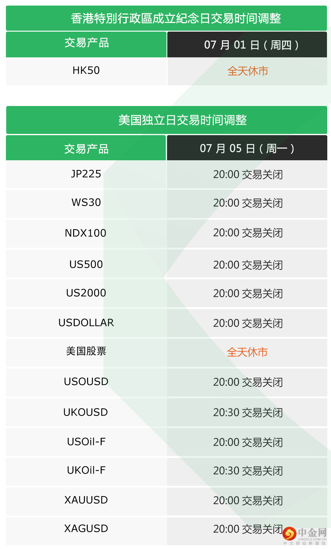 2021 年 07 月 01 日(本周四)与 07 月 05 日(下周一)因香港特別行政區成立紀念日及美国独立日,部分产品交易时间将做出如下调整: