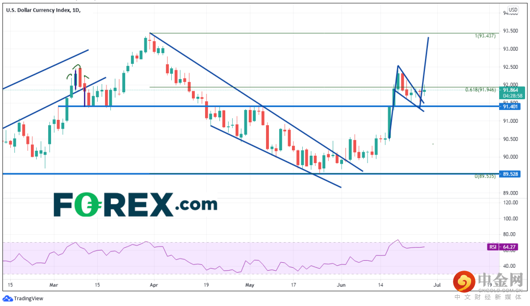 美元指数日图自从5月25日上破肇始于4月1日高点93.47附近的下降楔形以来一直在走高,但直到6月16日FOMC透露较预期强硬的指引才开始大举冲高。下降楔形的突破目标在楔形的100%回档位,但请注意,美元指数涨势已止步于4月1日高点到5月25日低点行情的61.8%回档位,即92.00上方不远处。美元指数之后回撤并形成三角旗,近期上破三角旗。三角旗的突破目标为突破位加上三角旗旗杆的长度,此例中在93.35附近,距离楔形突破目标93.43附近咫尺之遥。