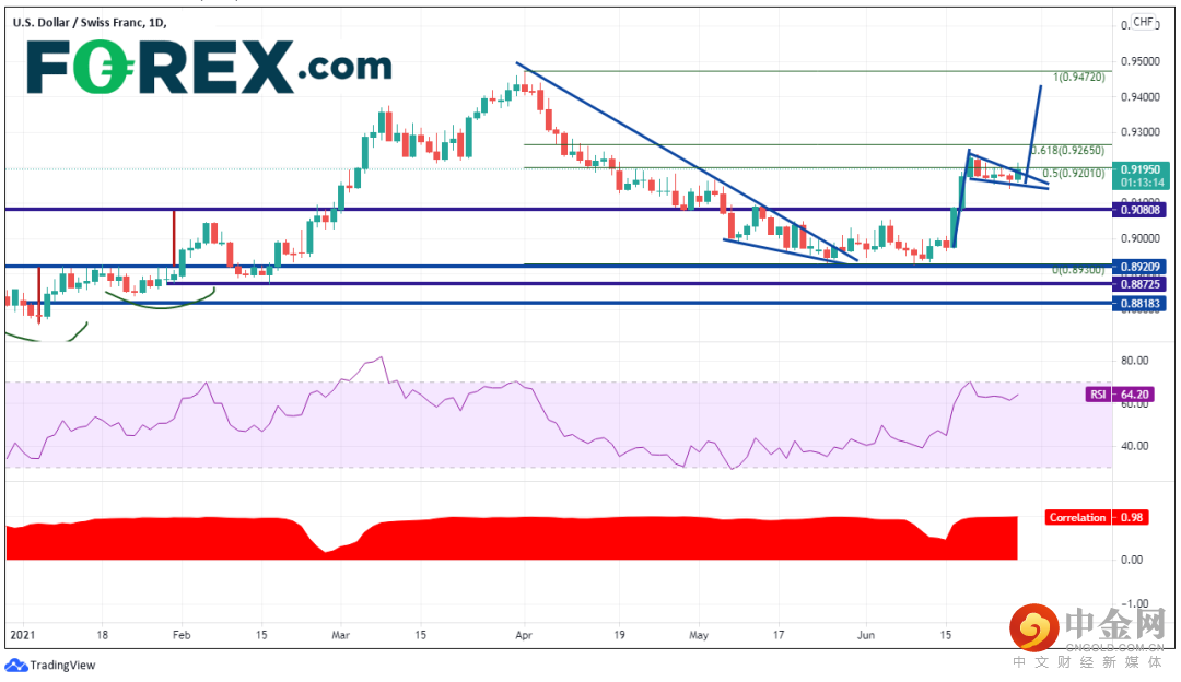 请注意美元/瑞郎日图从4月1日形成高点以来构筑了下降楔形,5月27日开始打破楔形,但直到6月16日才开始大举走高。美元/瑞郎的涨势止步于4月1日高点到5月27日低点行情的61.8%回档位下方,即0.9250附近。该货币对回落并形成三角旗形态,近期向上突破该形态。三角旗突破后的目标在0.9432附近,接近于楔形突破目标0.9472。