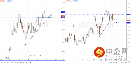 美日天图:目前趋势在测试前期水平压制带110.943区域后继续受阻回落,虽然整体趋势处于在多头阶段中,下方又有上升趋势线的支撑作用。但从日内4小时级别,价格有跌破关键位置迹象。可适当关注价格在此区间附近的表现,如果继续破位将可能转势为空。