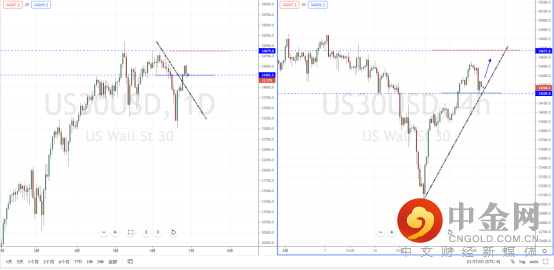 道琼斯指数:目前行情在短期突破下降趋势线后进入调整,其水平支撑带在34002.5附近,虽然整体格局处于在多头阶段。从日内4小时级别,价格在前期极端拉升后,进入小幅调整。可适当关注价格调整后继续上行的多头机会,但需要主注意上方空间幅度,目标位置参考前期高点附近。
