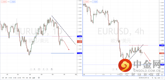 欧美天图:目前行情空头流向确立,虽然价格偏离下降趋势线较远,但趋势在短期回测上方压制带1.19836附近后受阻。从日内4小时级别,其趋势在受阻后继续跌破上升趋势线下行,可适当关注价格调整后继续下行的空头机会,下方区间目标位置参考1.17408一带。