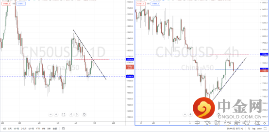 A50指数天图:短期价格在回测上方水平压制带17710.6附近受阻,并且价格处于在多重节点压制作用附近。从日内4小时级别,价格在突破短期压制后回落幅度较大,正测试关键支撑带17448.9附近。可适当关注价格在此区间附近的表现,如果破位下行,将继续保持空头方向。