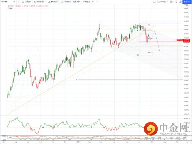 疲软,反映了技术展望的负面 • -0.1% 位于 1.3859-1.3878 区间 – 一旦亚洲完全开放后流动性可观 • “自由日”前的负面英镑信号 • 图表;每日动量研究,5、10 和 21 日均线下跌 • 21 天布林带下滑 – 看跌设置表明进一步下跌 • 10 DMA 反复封顶,现在位于 1.3908 – 关键阻力 • 下降趋势目标测试 1.3756,占 1.3756 的 61.8% 2021 年上涨 • 1.3786 6 月低点和 1.3908,10 日均线初始支撑和阻力 在“自由日”之前的负面英镑信号 虽然英镑已处于持有模式一周,但最近的上行失败使日线图显示出明显的看跌倾向英国的 7 月 19 日“自由日”。在卫生部长周末辞职后,英国的政治争议仍在继续。他的继任者 Sajid Javid 坚信疫苗接种与 COVID-19 传播之间的战斗即将获胜,周一新增病例 22,868 例,仅 3 例死亡。贾维德和首相鲍里斯·约翰逊预计,随着英国全面重新开放并开始新的“常态”生活,“自由日”将在 7 月 19 日成为现实。如果重新开放成功,长期来看英镑将利好。短期内,技术面已经形成了明显的负面外观。每日动量研究,5、10 和 21 日均线均向南移动,而 21 日布林带下滑,这是一个强烈的看跌趋势设置。下跌的 10 天移动平均线在过去四天中的三天受阻,现在位于 1.3909。收于 1.3909 以上将削弱下行倾向,收于 1.4018/28(6 月跌幅的 50% 和 21 DMA)上方将结束下跌。下跌趋势的目标是测试 1.3756,即 2021 年涨幅的 61.8%,然后是 4 月低点 1.3669