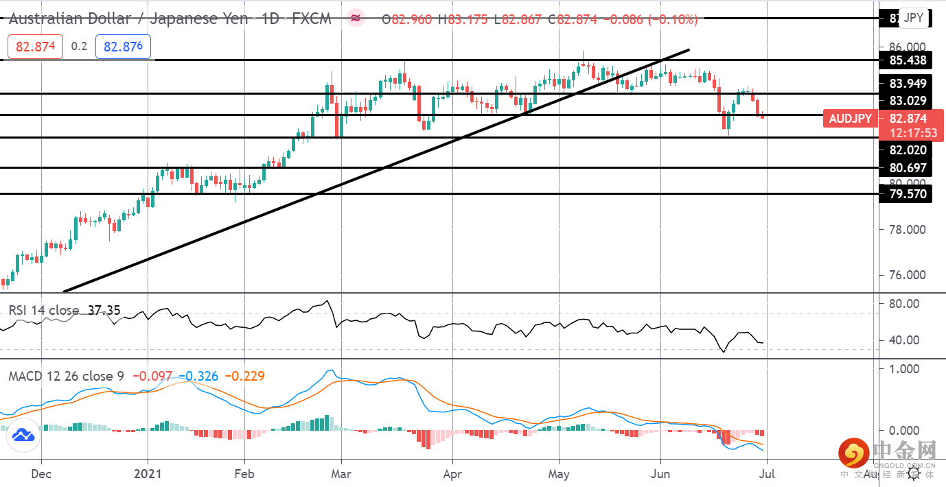 价格从 85.43 的高点跌至上升趋势线下方,随后跌破 83.94 水平以测试支撑位 82.02。这是该货币对的重要支撑位,RSI 和 MACD 均看跌,重点是进一步下跌,最初目标为 80.69,之后目标为 79.57。