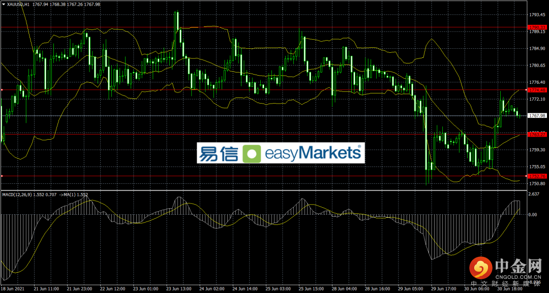 昨日美国公布了利好的6月ADP就业数据,非美货币一度出现震荡下行,好在触及下方关键支撑位置引发多头抄底盘涌入非美得以反弹。美股方面延续着强势表现,投资人的风险偏好情绪高涨。而黄金走势强于非美货币,在触及1753美元附近后大幅反弹,最高触碰1774美元附近,目前在1767美元附近徘徊。