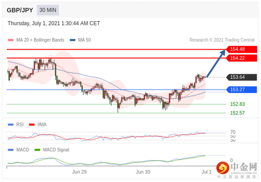 如跌破 153.27 ,GBP/JPY 目标方向定在 152.83 和 152.57 。