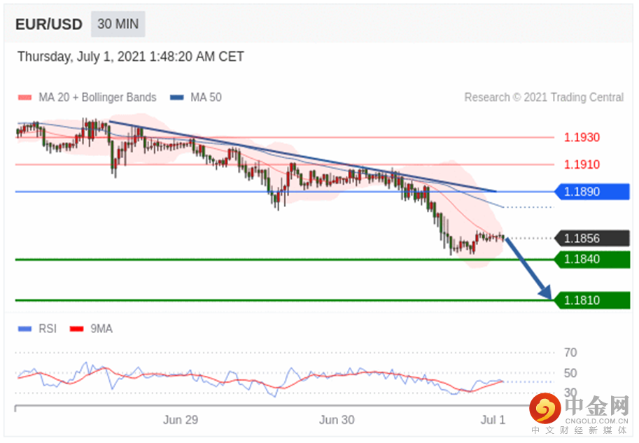 欧元/美元下跌37个点子,至1.1860。官方数据显示,欧元区6月消费者物价按年上涨1.9% (一如预期)。德国6月失业率稳定在5.9% (符合预期)。