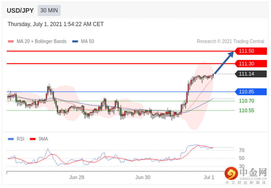 在 110.85 之上,看涨,目标价位为 111.30 ,然后为 111.50 。
