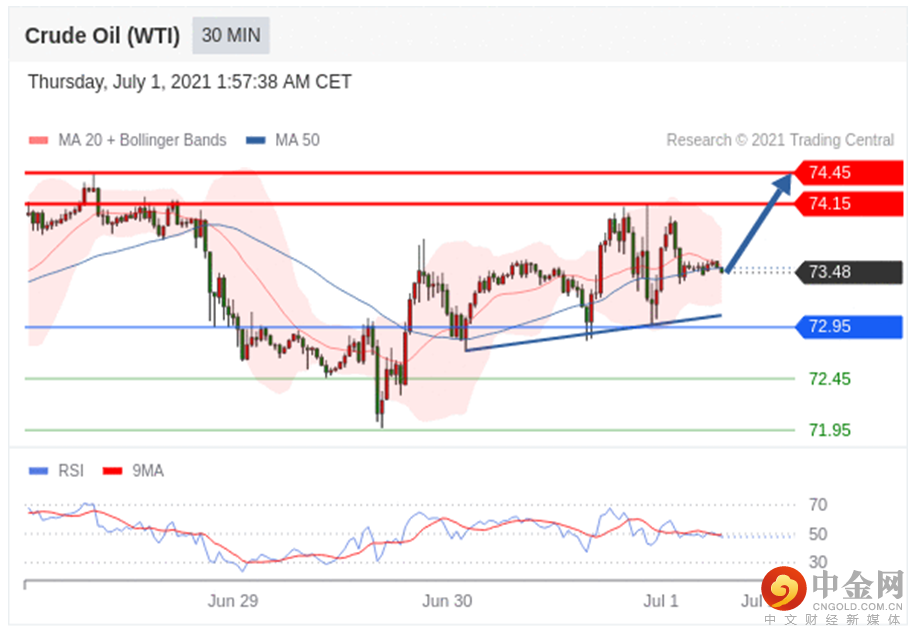 在 72.95 之上,看涨,目标价位为 74.15 ,然后为 74.45 。