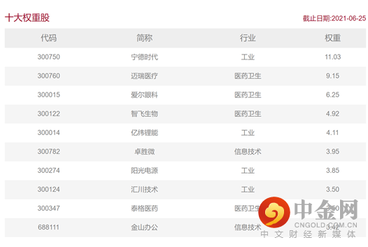 也是我们非常关心的,它们分别代表指数中每只股票所占的比例和所属的行业分类。还是来看中证科创创业50指数,它的前十大权重股包括了宁德时代、迈瑞医疗等新兴行业的大龙头。