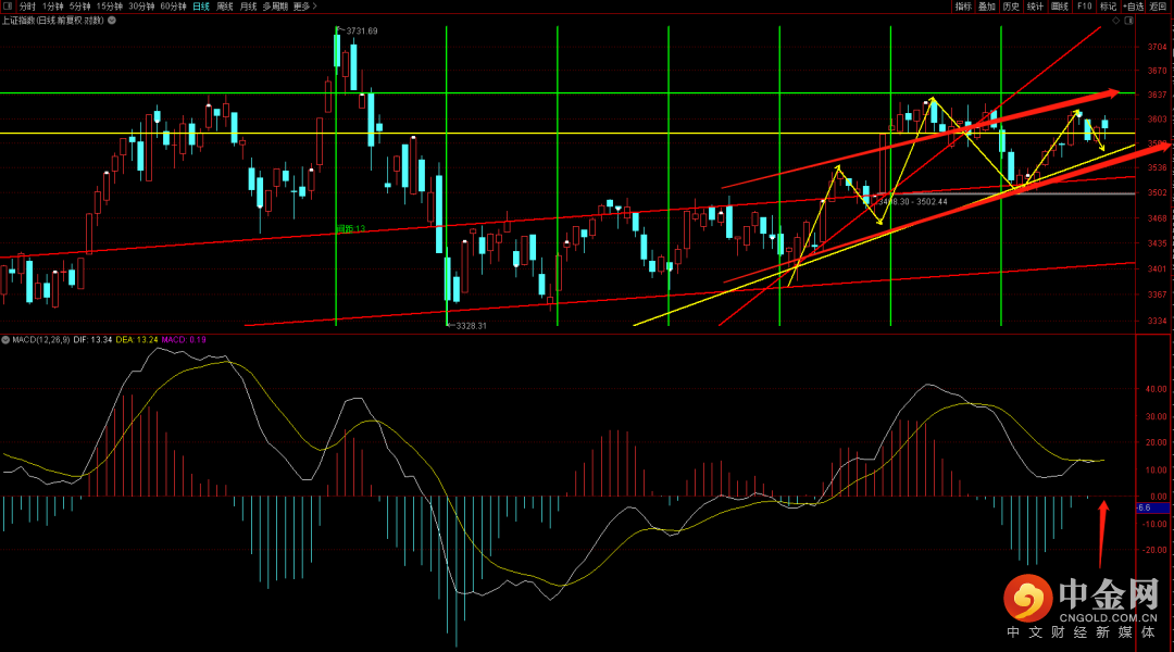 大盘全天波动较为剧烈,短期值得一提的是这边还存在着向上攻击的动能,但可持续的时间大概率不会太久,从结构上看有点头肩顶的韵味,而后续在出现收盘跌破3560需要注意管住手,等待新的企稳,预期好的话支撑可能出现在3480,预期弱的话可能回到前期上升通道下轨附近(大概在3380附近)