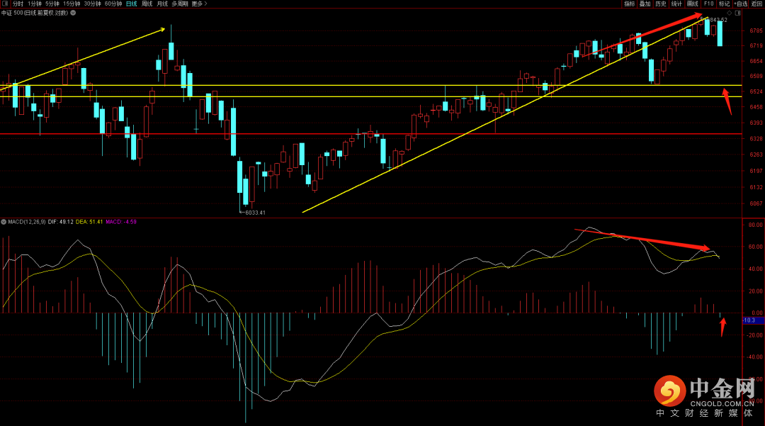 中证500出现了日线顶背驰结构,短期需要注意高抛节奏,大概率会有一段比较久的调整走势,而下方首先需要关注6500附近的平台支撑,如果能在这个位置出现止跌,则后续大概率会围绕这个位置做一段盘整走势。