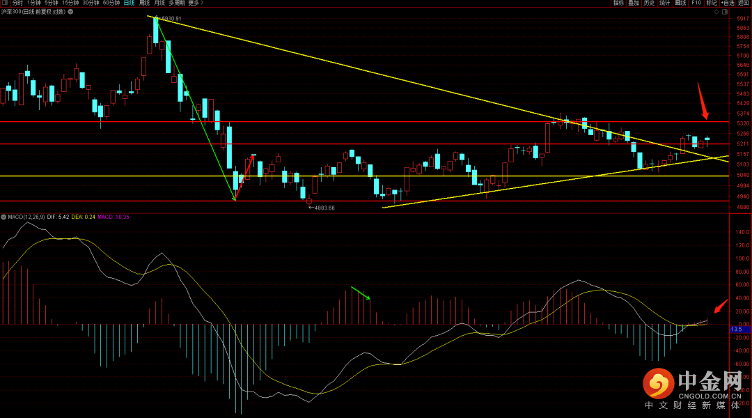 沪深300短期出现了顶分型结构,后续在没有跌破上升趋势线之前存在扩张向上的走势,而向上扩张的话强压制就可能出现在5320附近,在触碰到这个位置附近大概率会出现再次的回落走势。