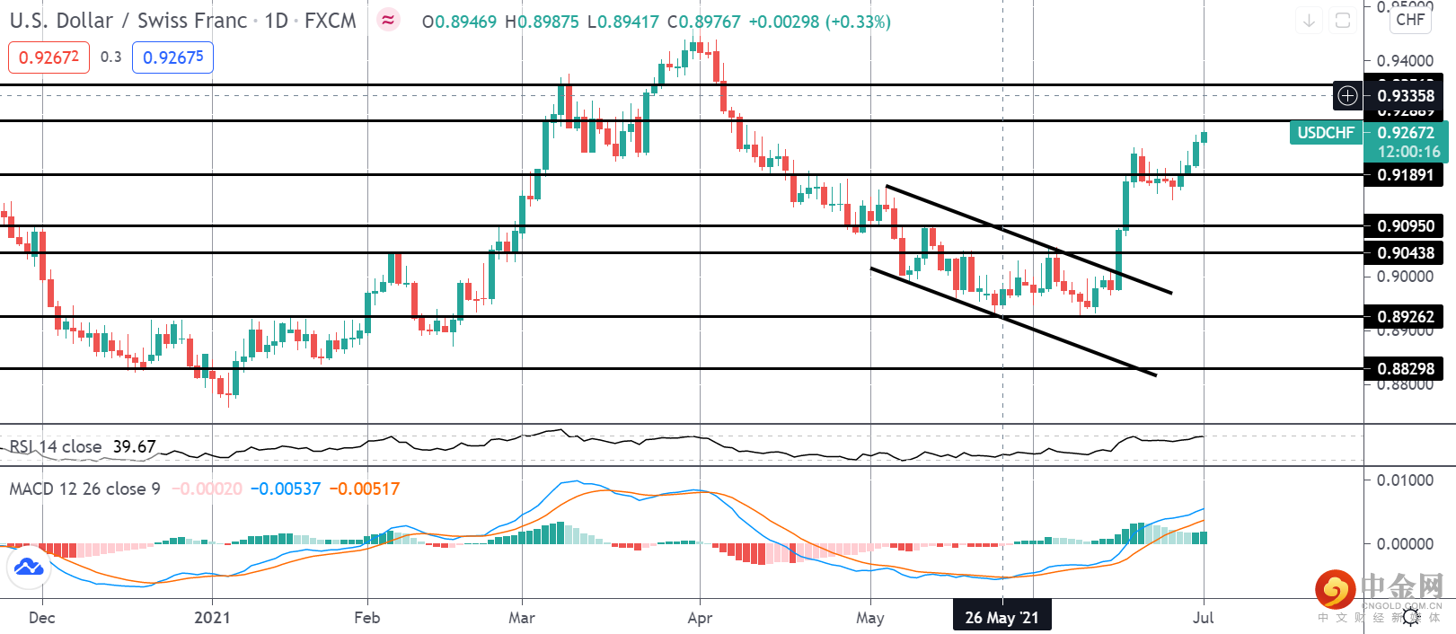随着美联储上调其点阵图预测,暗示加息现在最早可能在 2023 年到来,并且随着经济增长和通胀预测的上调,市场现在完全预期今年会缩减利率。此外,随着瑞士央行重申其维持宽松政策的承诺,美联储和瑞士央行之间的货币政策分歧似乎将使该货币对朝着更高的价格发展。