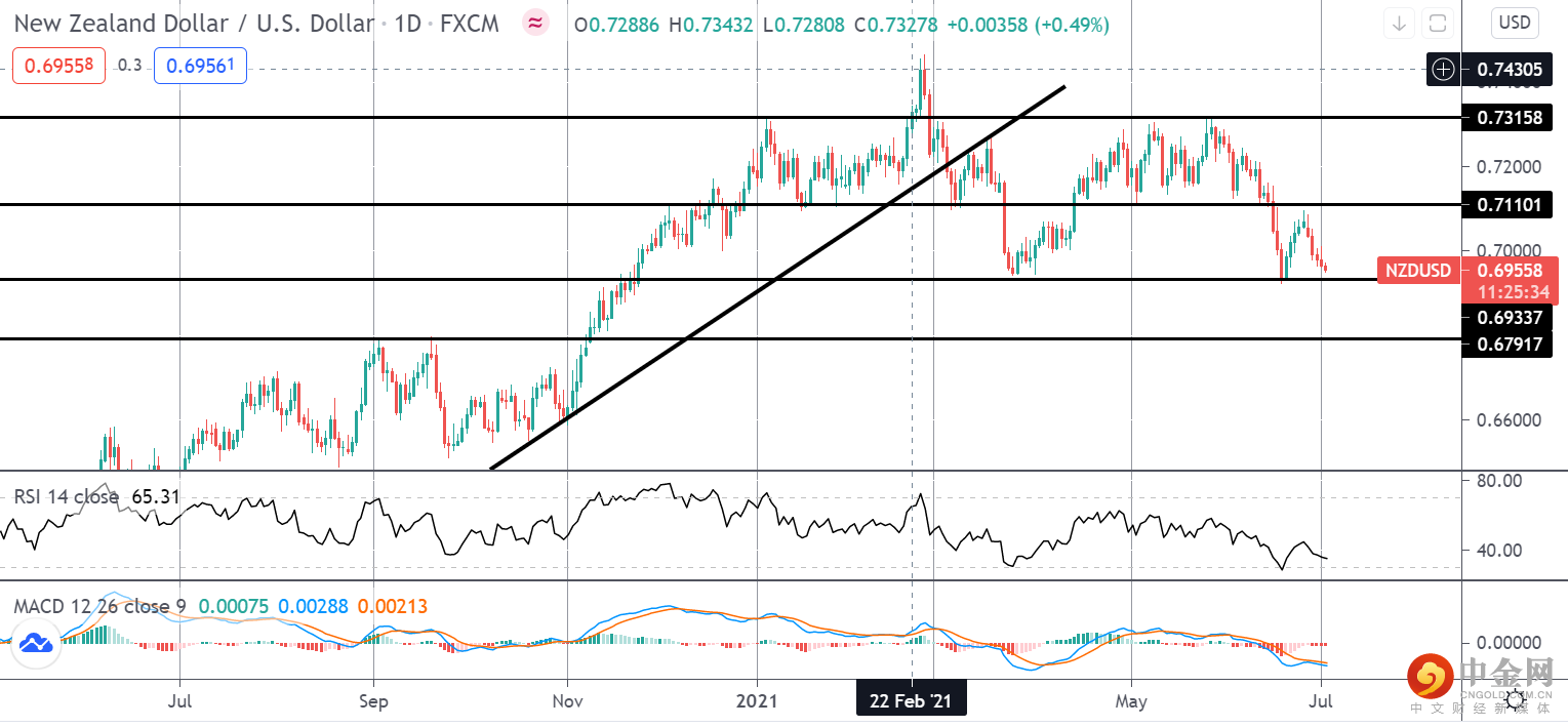 由于纽元兑美元的跌幅不及澳元,但随着零售社区现在增加其多头头寸,该货币对有走低的空间。今天的强劲释放应该会严重打压新西兰元。该货币对目前位于 .6933 支撑位上方。 MACD 和 RSI 均看跌,跌破该水平将为接下来跌至 0.6791 水平开辟道路。