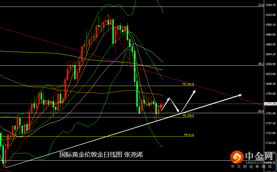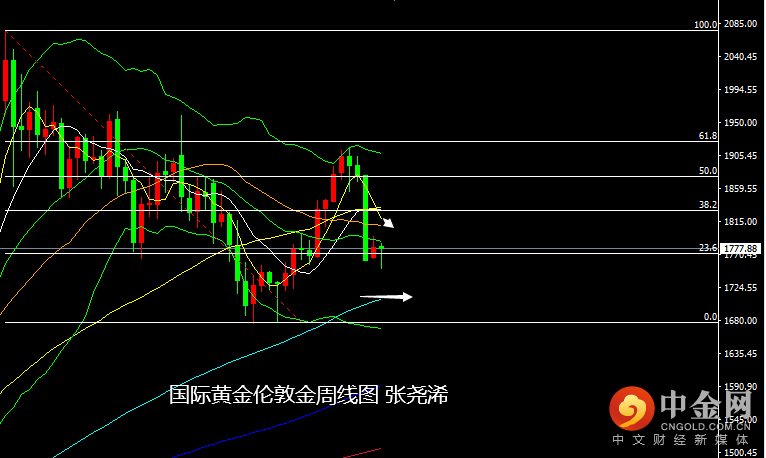 周线级别:金价本周在跌破50%回撤线支撑后,探底回升,目前走出较长下影线,暗示多头仍有一定反弹预期,不过本周低点临近100周均仍有较大距离,故此如行情再度走低,不排除触及于此的可能,上方布林带中轨也仍对金价造成打压,反弹也将关注两个位置,一个是中轨附近的1788美元,另一个则是30周均线到5周均线附近的1810美元附近偏上。