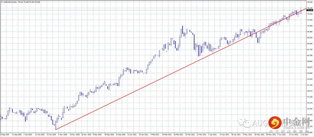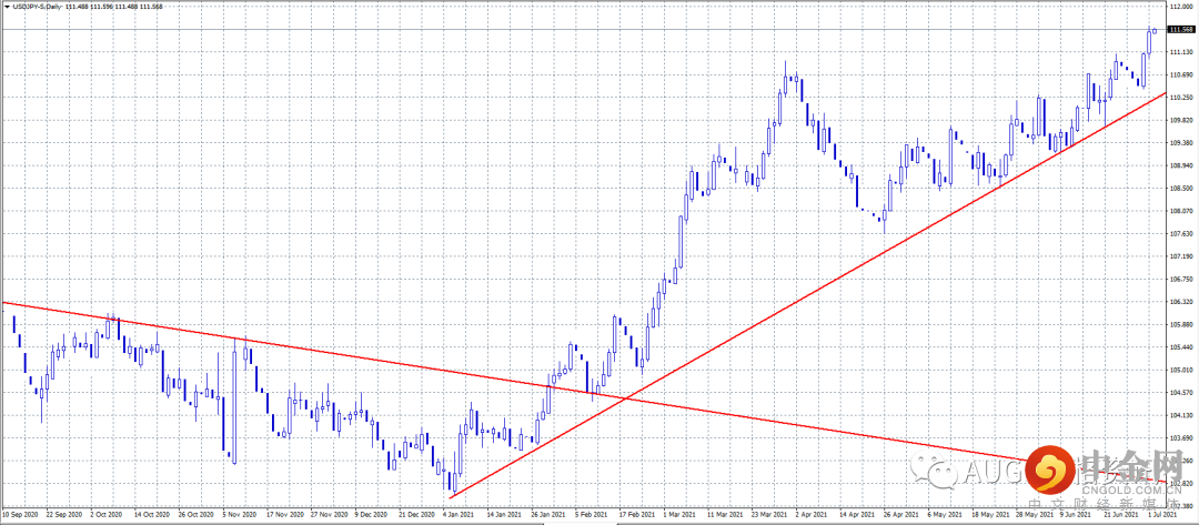 近日日元走势主要受到风险情绪、美元以及美债收益率的共同作用。昨日开盘美元/日元大涨。汇价连续两日大幅上涨,并攀升至一年高位突破111.50。美联储最关心的通胀继续保持稳定上升,接下来的焦点在于劳动力市场。今日美国官方数据非农可能会对汇价涨势构成挑战。若该数据疲软将引起美债收益率反弹,汇价将出现逆转。小时图显示,美元/日元继续走高。昨日,美元/日元在111.50上方维持大部分涨幅,看涨倾向完整。上方阻力看向111.75,接着位于112.00,下方支撑位于111.40,接着位于111.15。