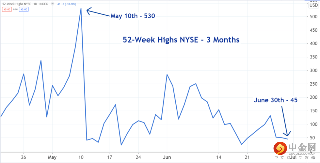 5 月的第二周,500多家在纽交所上市的公司股价创下了52周新高。而本周仅有不到50家公司的股票创新高。