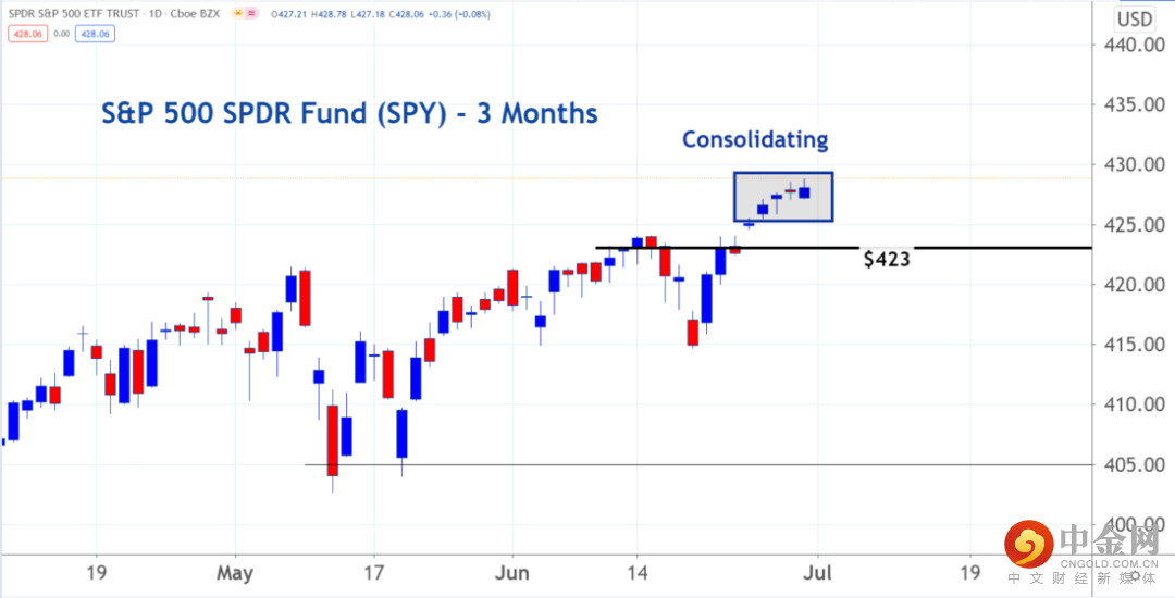 SPDR标普500指数基金在过去几天时间里一直在盘整,不过其涨幅在收窄。这是标普500指数疲软的信号。