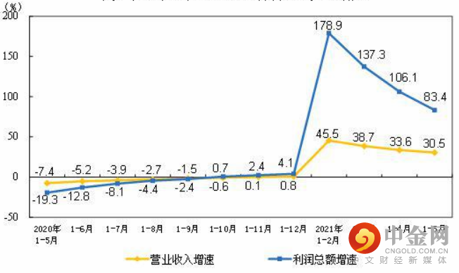 1—5月份,全国规模以上工业企业实现利润总额34247.4亿元,同比增长83.4%(按可比口径计算),比2019年1—5月份增长48.0%,两年平均增长21.7%。