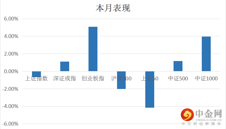本月各大指数呈现不同程度的分化,其中创业板指涨幅靠前,而上证50跌幅较大。