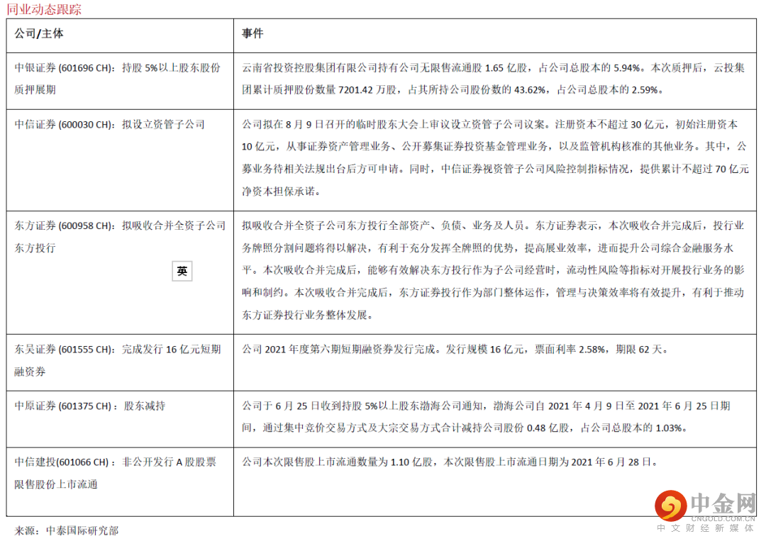 沪深交易所基金交易经手费收费标准下调 6 月 30 日,上交所和深交所发布《关于下调基金交易经手费和交易单元使用费收费标准的通知》。自2021 年7 月19 日起,上交所基金交易经手费收费标准下调至按成交金额的0.004%双边收取,基金大宗交易经手费收费标准按调整后的标准费率同步下浮,下浮幅度维持不变,即按竞价交易经手费标准的50%向买卖双方收取。交易单元使用费收费标准由原每个交易单元每年5 万元,下调至每个交易单元每年4.5 万元;而自2021 年7 月19 日起,深交所基金交易经手费收费标准由按成交金额的0.00487%双边收取下调至按成交金额的0.004%双边收取。基金大宗交易经手费收费标准按调整后标准费率的50%双边收取。我们认为,基金交易经手费下调降低基金投资者的交易成本,引导资金流入基金市场,可增加证券市场的流动性,而各券商争夺市场份额而努力提升自身的财富管理能力,向财富管理的转型将加速。