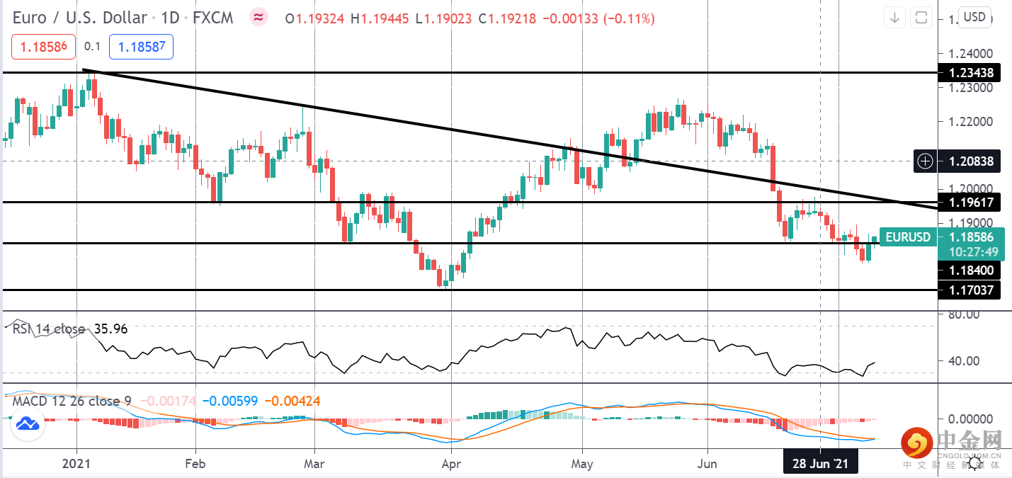最新跌破 1.1840 水平伴随着 MACD 和 RSI 的强劲看涨背离。虽然低于该水平,但重点是接下来继续走低至 1.1703 水平。然而,在该水平上方,焦点将集中在 1.1961 水平,该区域也是看跌趋势线。多头需要看到突破这一水平才能影响情绪的变化。