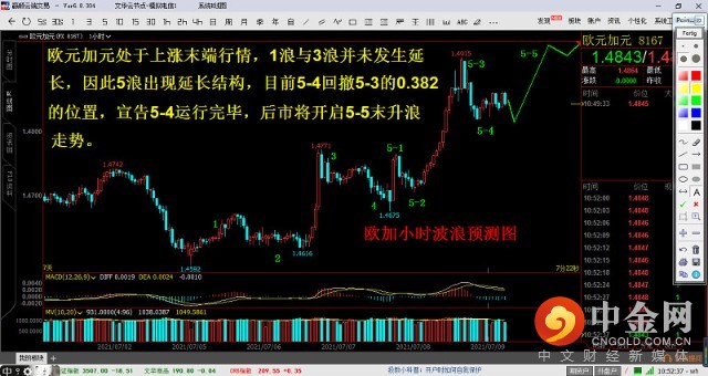 欧加小时波浪预测图。欧元加元处于上涨末端行情,1浪与3浪并未发生延长,因此5浪出现延长结构,目前5-4回撤5-3的0.382的位置,宣告5-4运行完毕,后市将开启5-5末升浪走势。