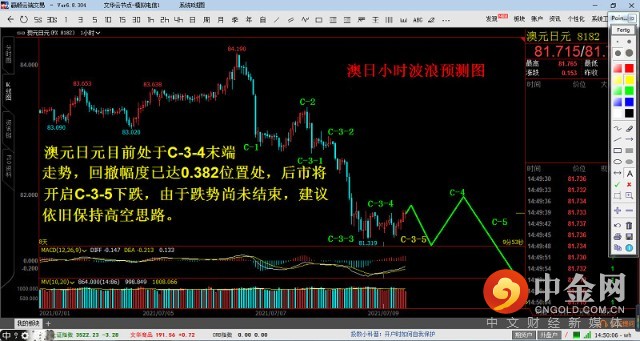澳日小时波浪预测图。澳元日元目前处于C-3-4末端走势,回撤幅度已达0.382位置处,后市将开启C-3-5下跌,由于跌势尚未结束,建议依旧保持高空思路。